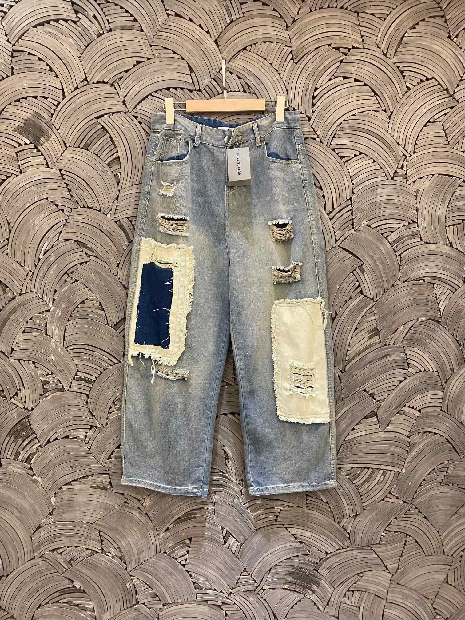 The Balenciaga High-Street Patchwork Heavy-Duty Design Haute Couture Runway Patchwork Denim Pants Couple Set combines practicality with fashion-forward design. A reliable choice for those with an active lifestyle. The high-quality construction guarantees longevity, making it a worthwhile investment. Available in multiple sizes, it offers a comfortable fit for a wide range of body types.