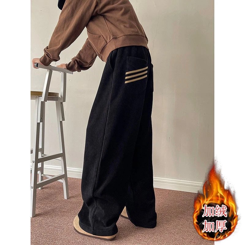 Street Style Black Triple Stripe Pocket Fleece-Lined Straight Leg Pants