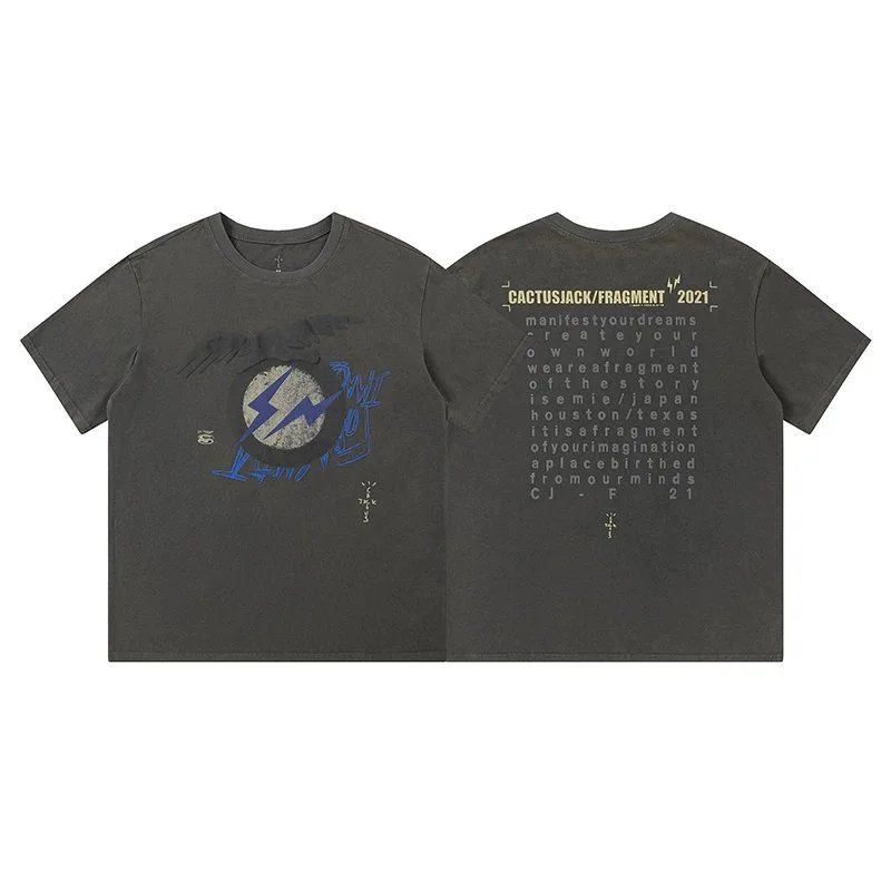 TravisScott&FragmentDesign Washed Eagle Lightning Animal Print Short Sleeve T-Shirt